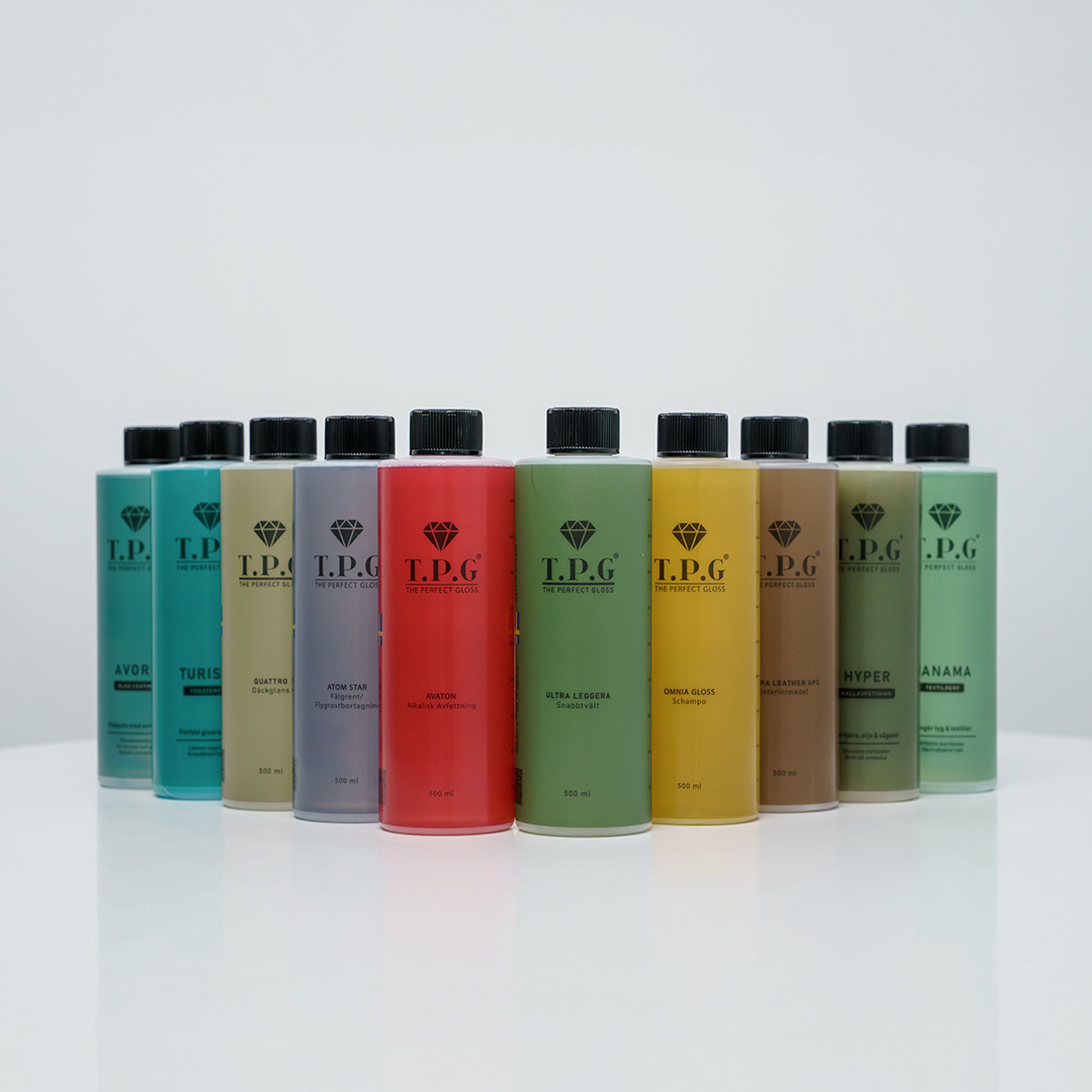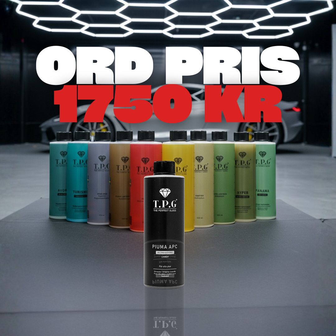 10 flaskor. Full kontroll. Från asfalt till glas, däck, interiör och lack – det här är hela TPG-sortimentet i ett komplett kit.