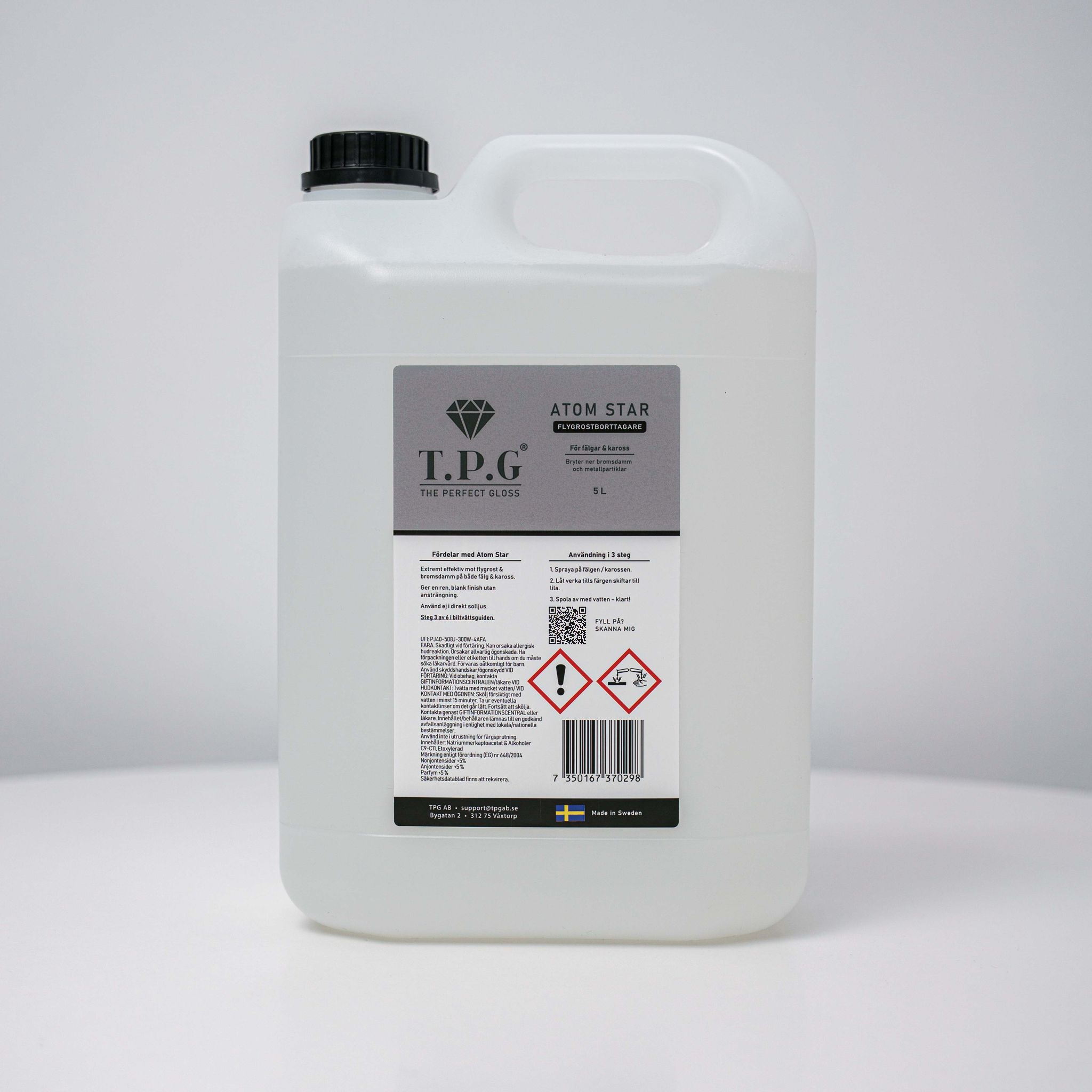 Atom Star löser upp flygrost, bromsdamm, inbränd smuts och bruna prickar på lacken. Produkten är skonsam mot lacken och ändrar färg till lila när smutsen är upplöst, vilket indikerar att den är redo att sköljas av. Få en strålande ren bil med en enkel och säker rengöringsprocess med Atom Star.