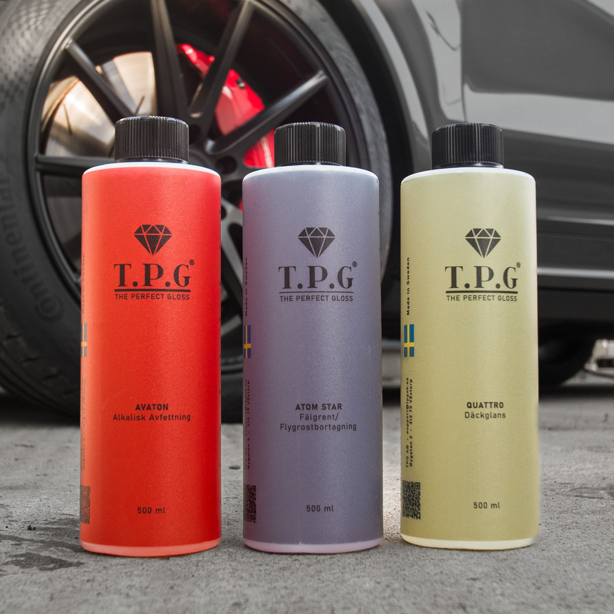 Atom Star från TPG, The Perfect Gloss, är en specialformulerad rengöringsprodukt för fälgar och karosseri. Den ändrar färg till lila när smutsen är upplöst och redo att sköljas av, vilket ger en perfekt ren yta.