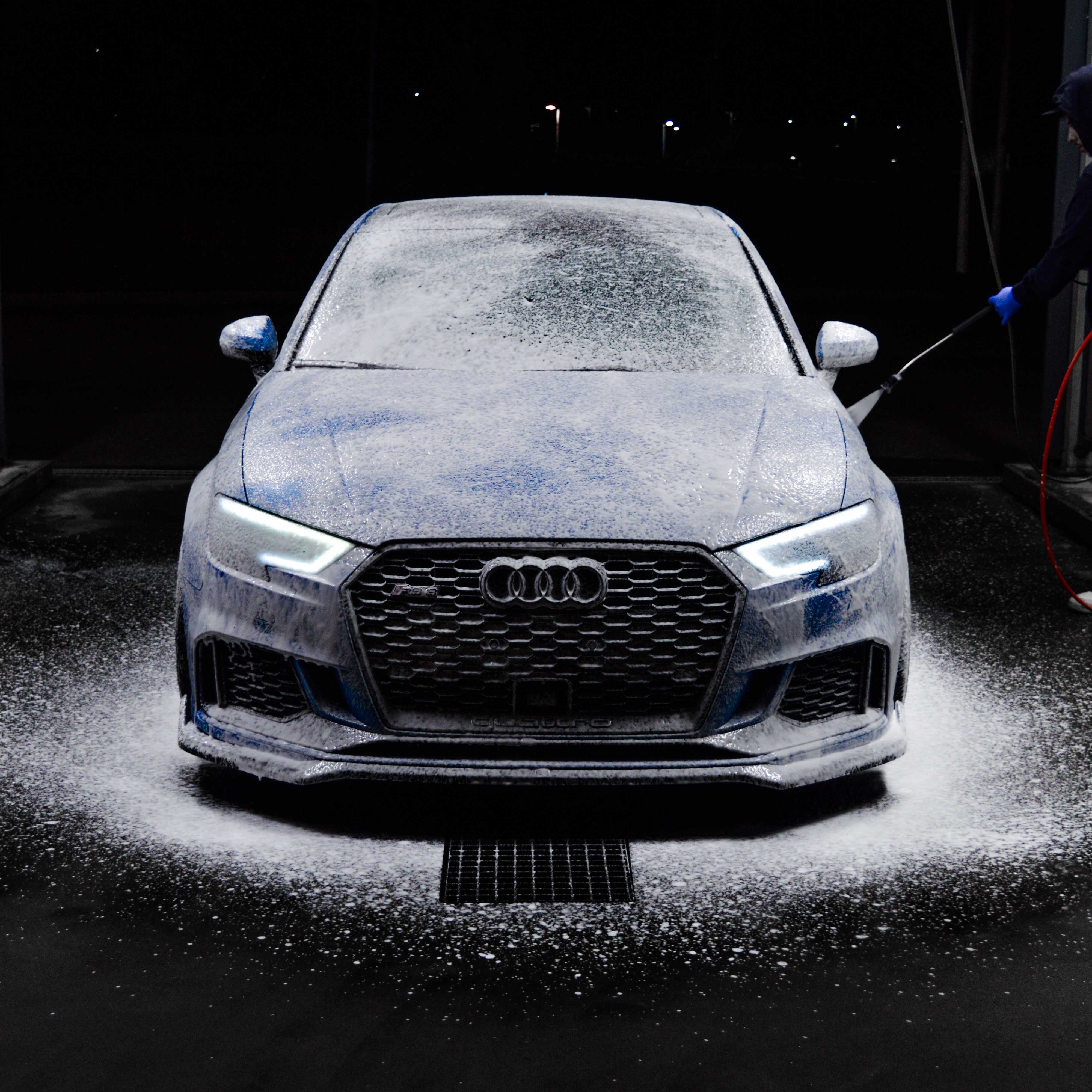 Spola av noggrant med vatten, helst med en högtryckstvätt, för att avlägsna allt schampo och smuts.